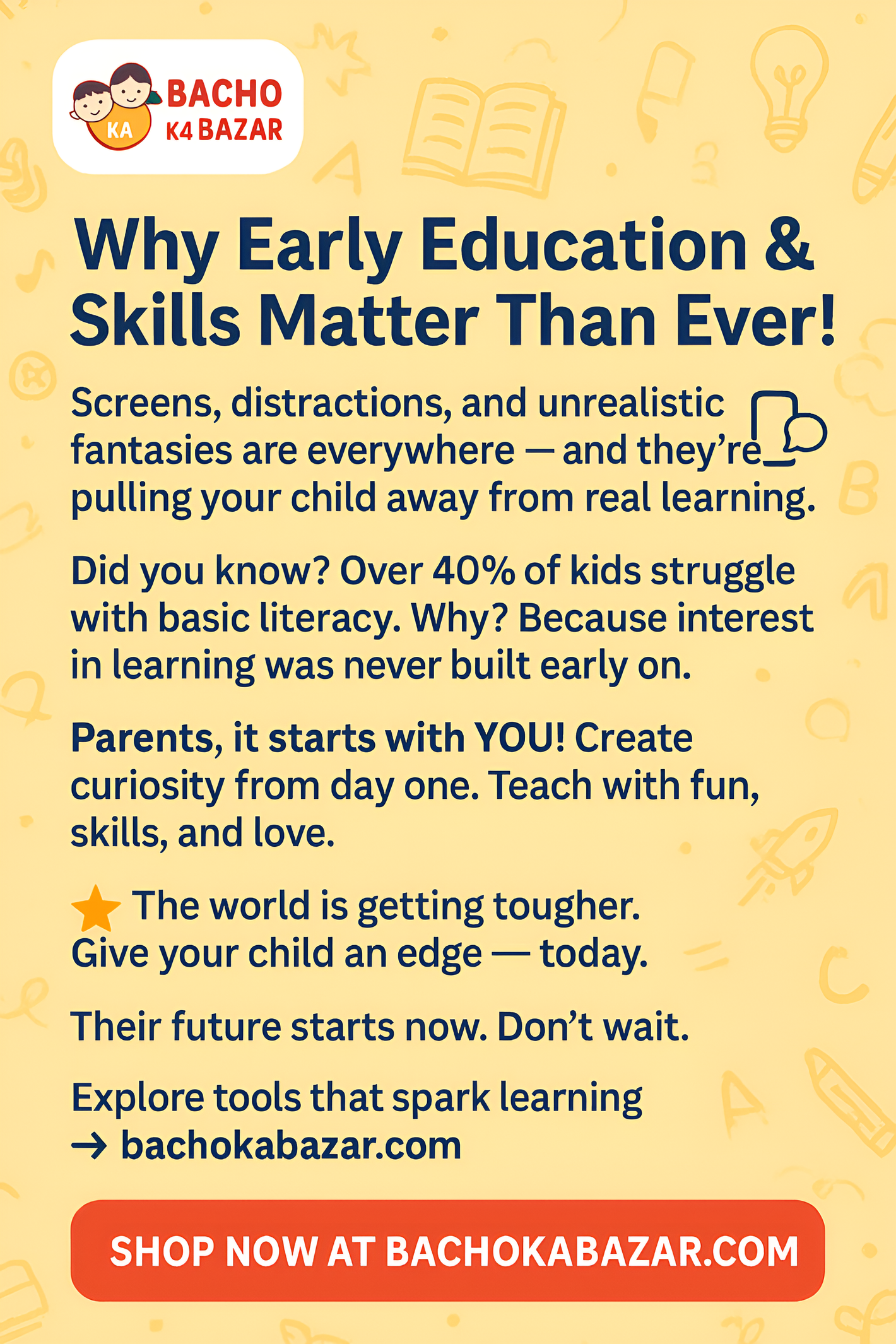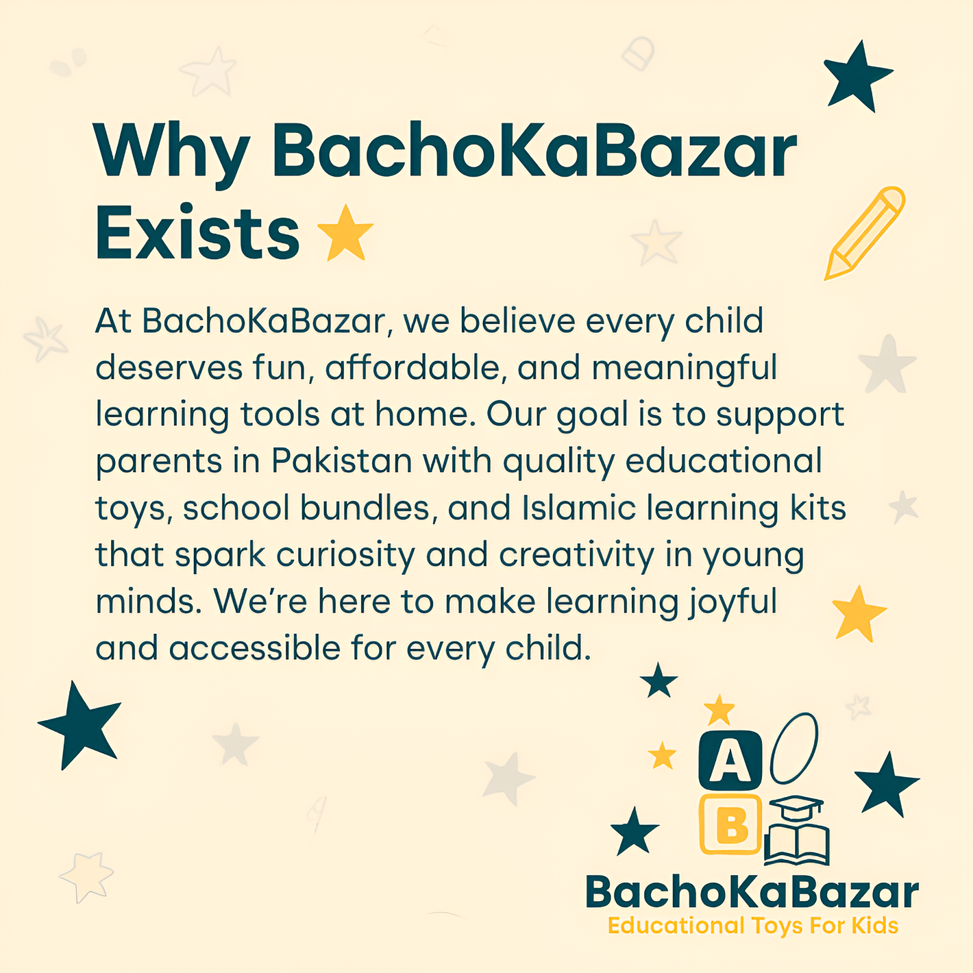 More than 40% of Pakistani children can’t read or write properly, and this number is growing fast. In today’s time, competition is everywhere even for young kids. If your child doesn’t get the right start, they can easily fall behind. That’s where Bacho Ka Bazar comes in. Our educational toys for kids help your children enjoy learning at home. These toys build real-life skills, boost their confidence, and prepare them for school and life ahead. You’re not just buying a toy you’re giving your child a better chance at a bright future. Don’t wait help your child grow smarter and stronger, right from the start.